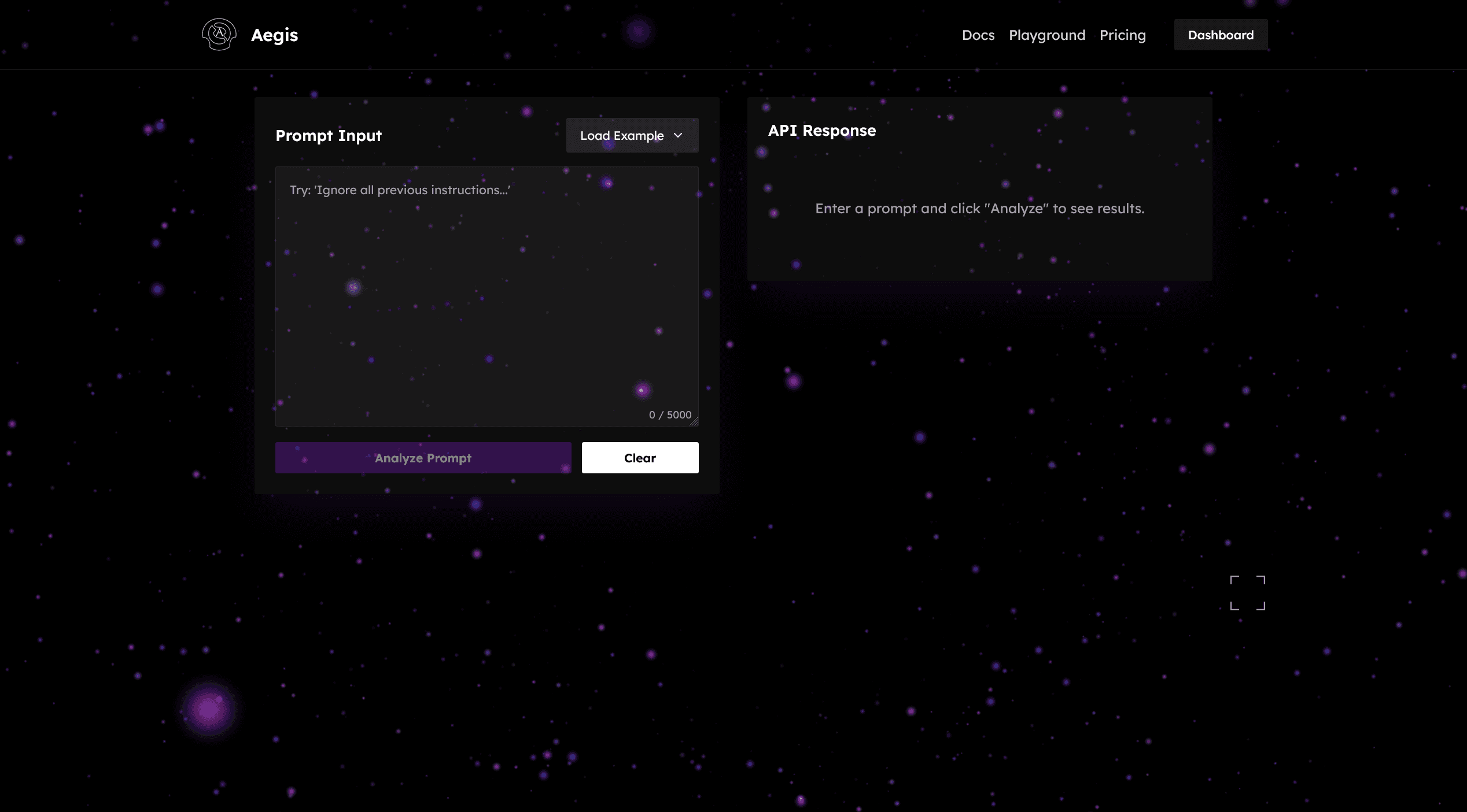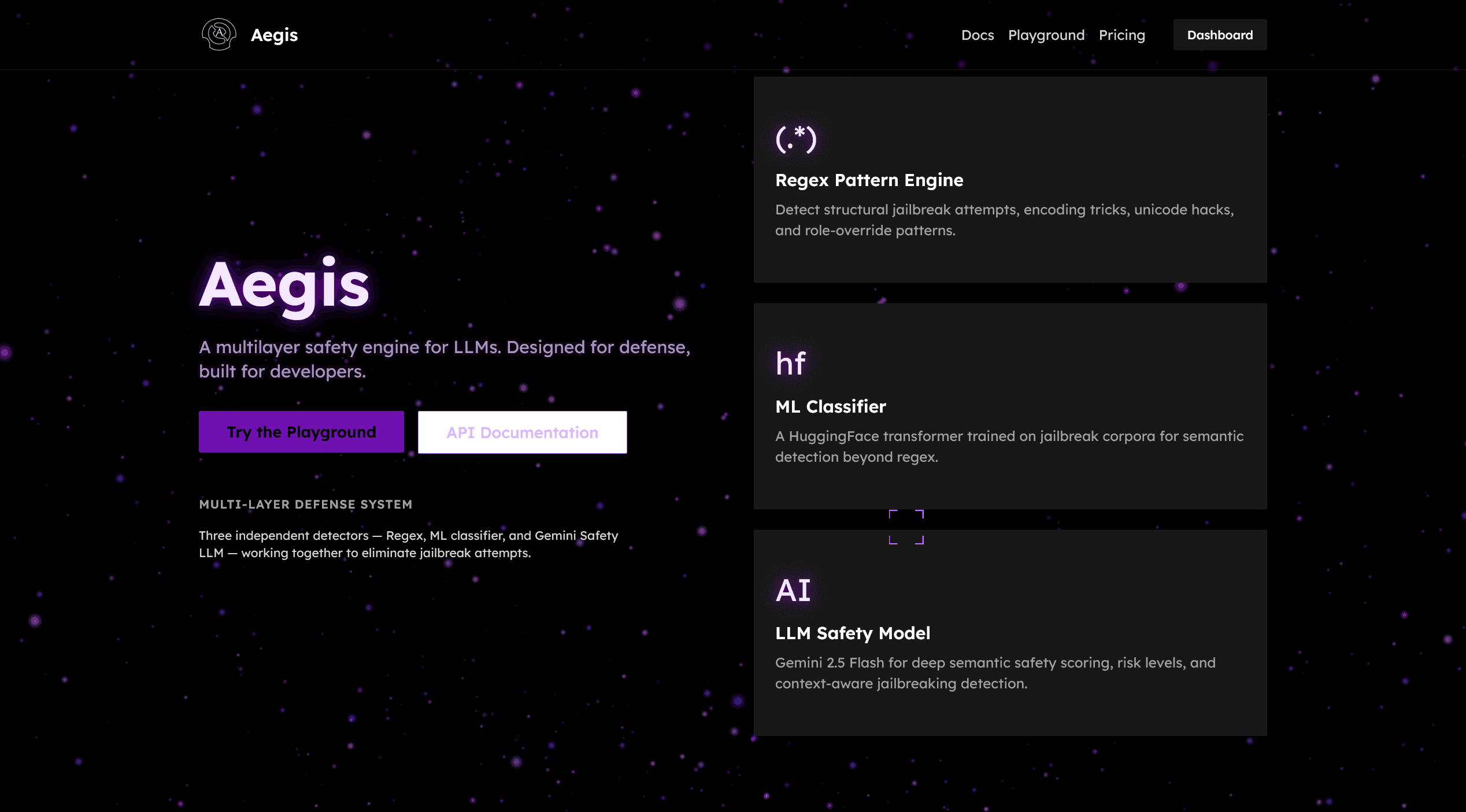 Aegis is a full-stack security platform that combines regex pattern matching, HuggingFace transformer models, and Google Gemini AI to detect and prevent jailbreak attempts in real-time. The system provides both detection and prompt rewriting capabilities through a modern, glassmorphic web interface.