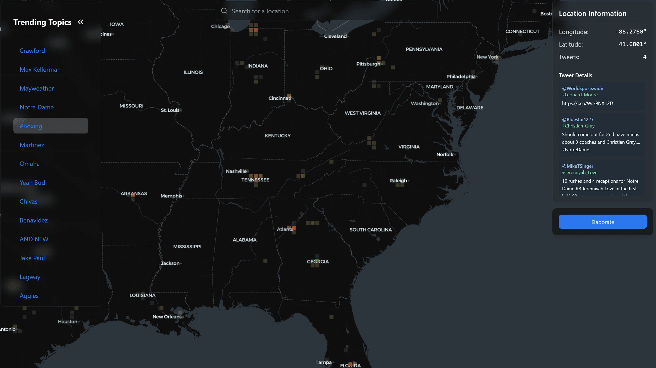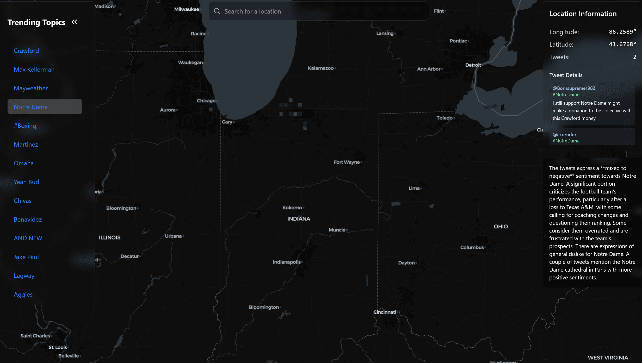 An interactive visualization platform that maps tweets with location data and provides AI-powered trend explanations including sentiment analysis through Gemini API.