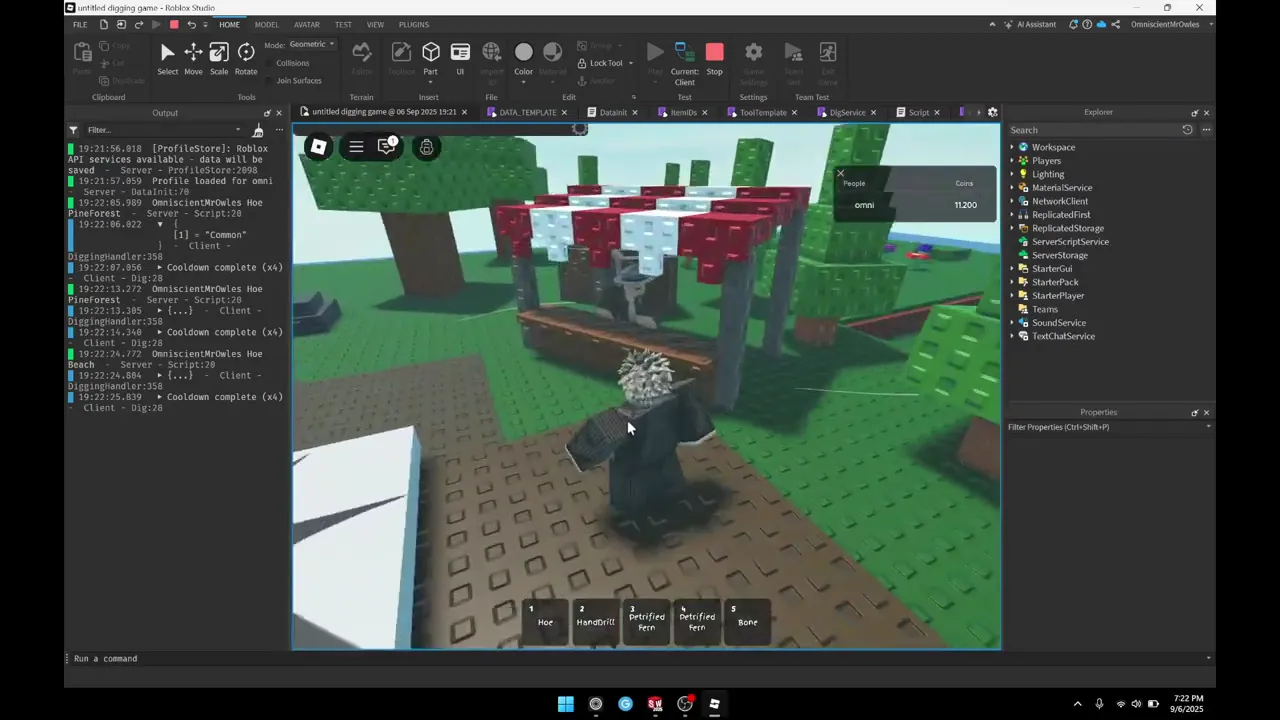 The Digging Service handles the actual core mechanic of the game. If the user is in a specified dig zone, they are allowed to dig. The handler creates a "rarity path" per each new dig started, where each dig's item rarity is predetermined by randomly by the server. The tool's "luck boost" impacts this rarity path, where the higher it is the more likely you are to get a rare item. This can be seen in the video demonstration, the video shows [1] = "Common", meaning the player is meant to receive a common tier item.